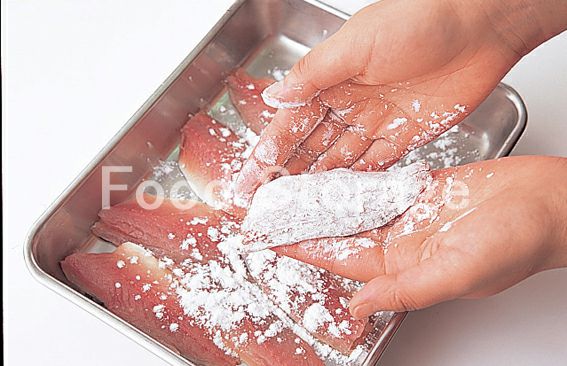 3にかたくり粉をまぶし、余分な粉ははたき落とす。 |