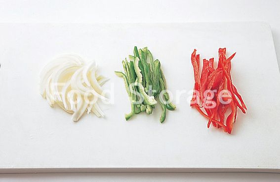 玉ねぎは薄切りに、ピーマン、赤ピーマンは細切りにする。 |