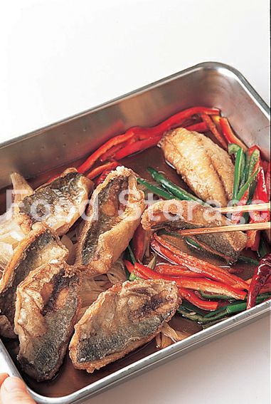7の油をきってバットに入れ、熱いうちに6をかける。時々返しながら、30分ほど漬ける。 |