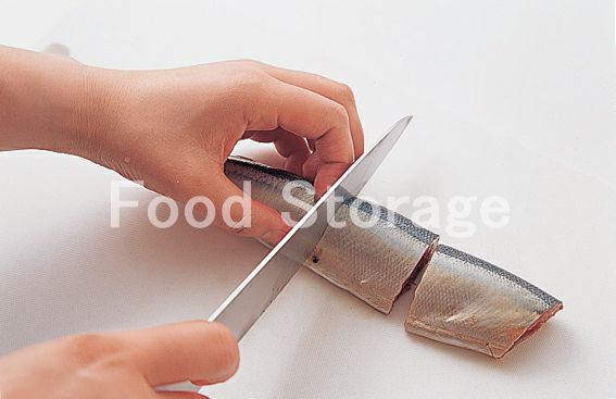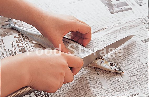 さんまはえらから包丁を入れ、頭を切り落とす。 |