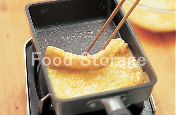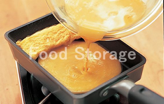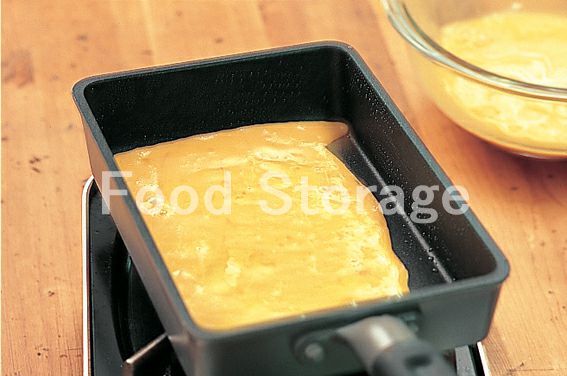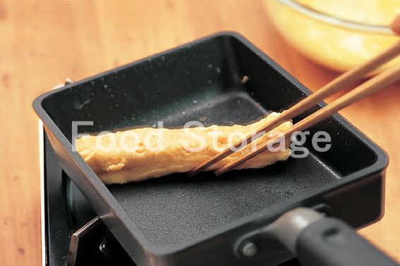 残りの卵液の1/3量を流し入れ、巻いた卵の下にも流し、半熟状態になったら向こう側から手前に巻き、7と同じようにする。これをあと2回繰り返す。焼けたらまな板に取り出して粗熱をとり、切り分けて器に盛る。 |