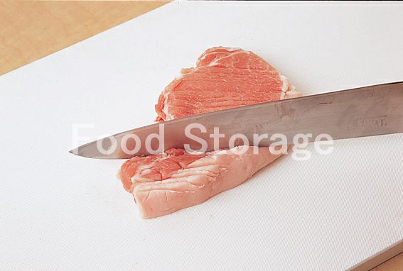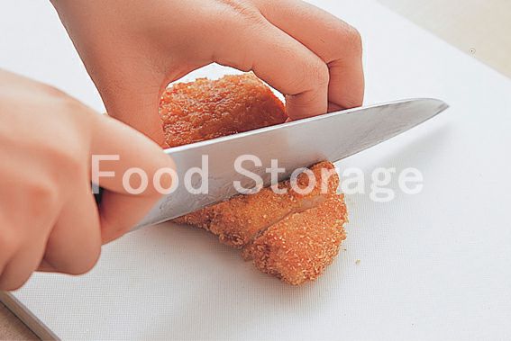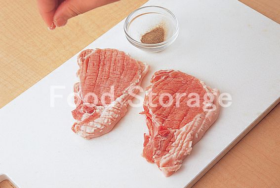 豚肉は、脂肪と赤身の間に包丁の先で切り込みを数か所入れ、筋を切る。 |