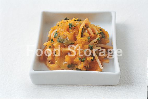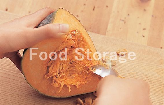 かぼちゃは、わたと種をスプーンで取り除き、4cm角くらいの食べやすい大きさに切る。 |