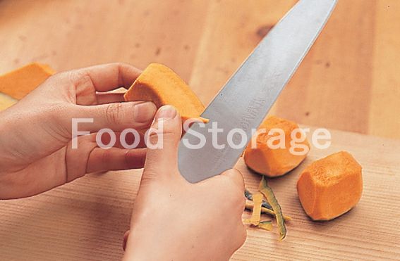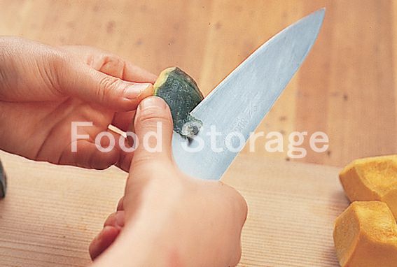 かぼちゃの皮の厚くかたい部分を、ところどころ包丁でそぐようにむく。 |
