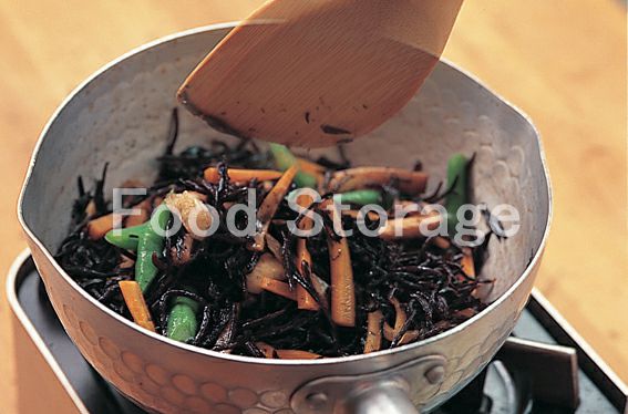 鍋にサラダ油を熱して、ひじき、にんじん、油揚げの順に入れて炒め合わせる。 |