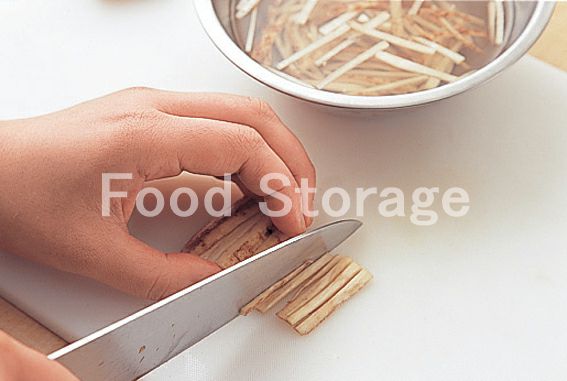 ごぼうは皮をこそげて4cm長さのせん切りにし、酢水にさっとさらし、水洗いして水気をきる。 |