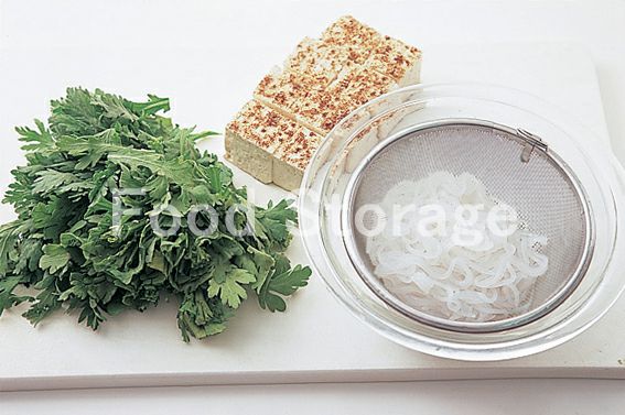焼き豆腐は8等分に切る。しらたきは熱湯でさっとゆでてざるに上げ、水けをきってざく切りにする。春菊はざく切りにする。 |