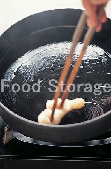 鉄鍋を熱して牛脂をこすりつけながら溶かし、なじませる。 |