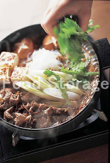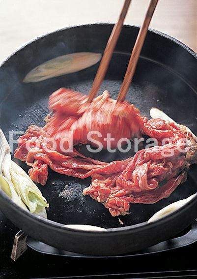 弱火にし、割り下少量を注いで肉にからめる。 |