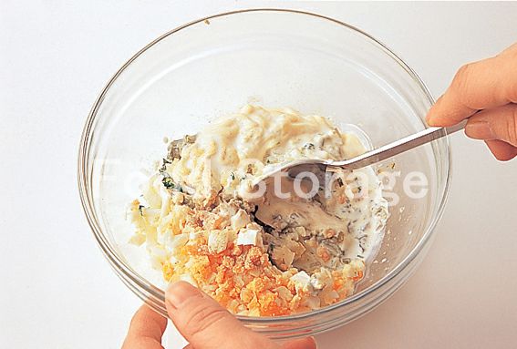 ボウルに1とaを加えて混ぜ合わせ、タルタルソースを作る。 |