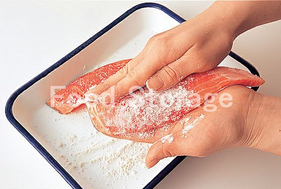3にまんべんなく小麦粉をまぶしつけ、余分な粉をはたき落とす。 |