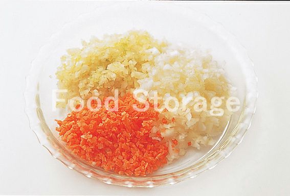 玉ねぎ、セロリ、にんじんはそれぞれ皮をむいてみじん切りにする。 |