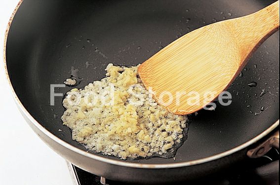 フライパンにオリーブ油とにんにく、しょうがを入れ、弱火にかけてよく炒める。 |