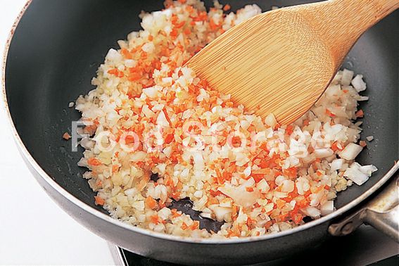 3に玉ねぎ、セロリ、にんじんを加えて中火にし、玉ねぎがきつね色になるまでよく炒める。 |