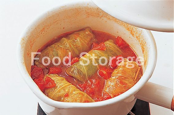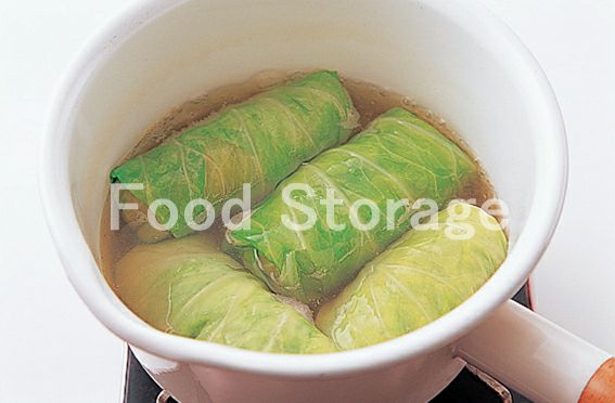 6を4等分し、広げたキャベツの手前にのせ、左右を折り込みながらきっちり巻き、巻き終わりを楊枝で止める。 |