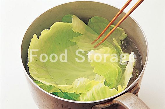 鍋にたっぷりの湯を沸かして塩を加え、キャベツを入れて菜箸で押さえながらゆでる。 |