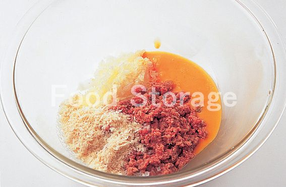 ボウルに合びき肉と玉ねぎを入れ、aを加える。 |