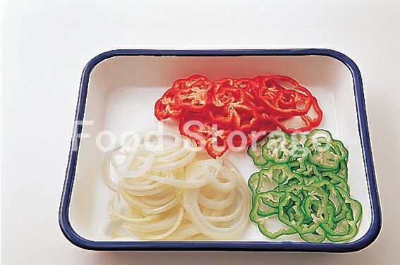 玉ねぎは薄い輪切り、ピーマン、赤ピーマンは種とヘタを取り除いて輪切りにする。ケッパーは粗みじん切り、プチトマトはヘタを取って半分に切る。 |