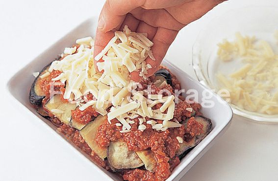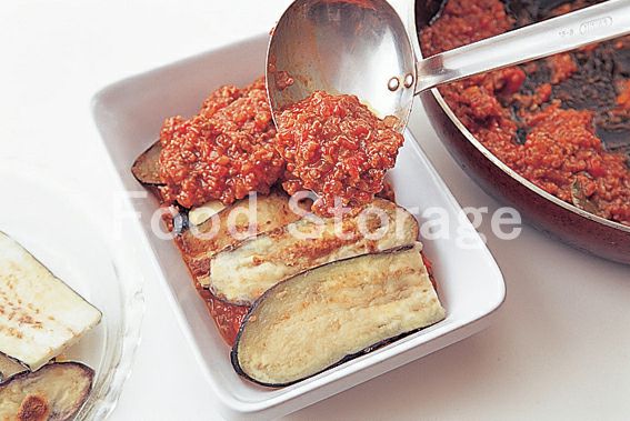 耐熱容器に4のソースを1/3量入れて広げ、なすの半量を並べてのせる。 |