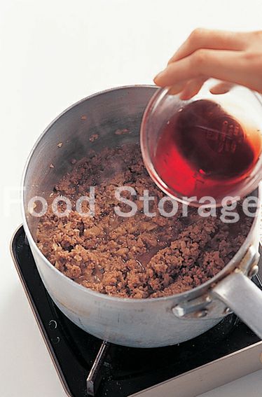 2に赤ワインを加えてアルコール分を飛ばしながら炒め、1のホールトマト、顆粒スープの素、ローリエを加える。 |