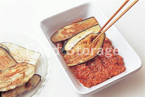 なすの上に1/3量のソースを広げ、残りのなすをのせて残ったソースをかける。 |