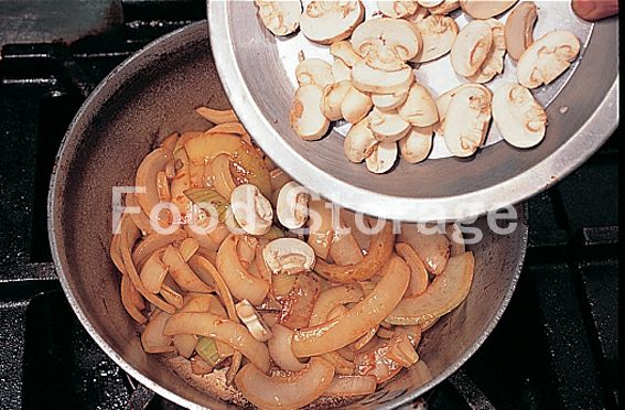 別のフライパンにバターを溶かして玉ねぎを入れ、きつね色になるまで5分ほどよく炒め、マッシュルームを加えて炒め合わせ、塩、こしょうをふる。 |