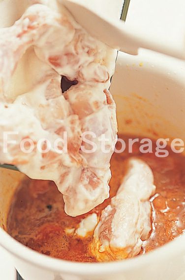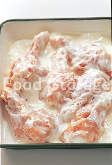 鶏手羽元は骨に沿ってフォークで刺して、塩、こしょうをまぶしてプレーンヨーグルトに20分ほど漬ける。 |