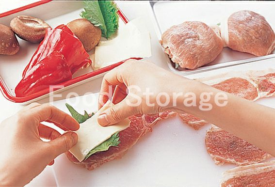 1の肉の横半分にしいたけ、青じそ、スライスチーズ、赤ピーマンを順に重ねてのせる。 |