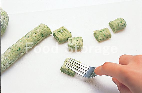 まな板に小麦粉(分量外)をふり、1をのせて直径1cmの棒状にのばし、2cm長さに切り分けてフォークの背を押しつけ、模様をつける。 |
