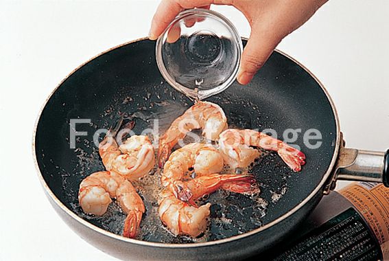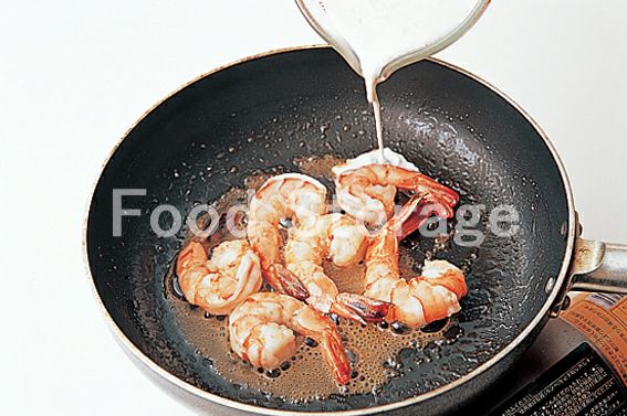 えびは殻をむいて背に包丁を入れて開き、背わたをとって塩、こしょうをふり、バターをとかしたフライパンに入れて炒め、白ワインを加えてからめる。 |