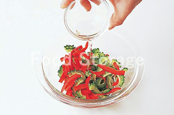 ゴーヤーは縦半分に切って種とワタを取り、薄切りにする。パプリカは長さ半分の細切りにする。 |