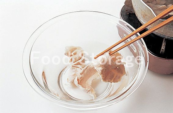 豚薄切り肉はaを加えた熱湯でゆでて冷水にとり、水けをきって食べやすく切る。 |