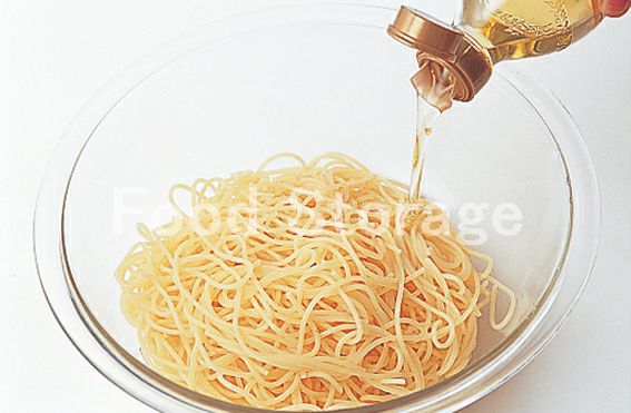 鍋にたっぷりの湯を沸かして塩大さじ1(分量外)を加え、カッペリーニを入れてゆでる。冷水にとってザルにあげ、水けをきってオリーブ油をからめておく。 |
