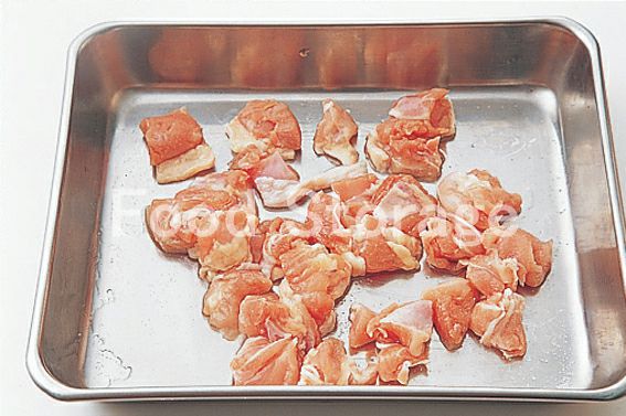 鶏もも肉は2cm角に切り、塩、酒をもみ込む。 |