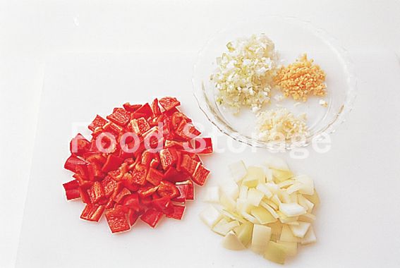 赤ピーマン、玉ねぎは1.5cm角に切り、にんにく、しょうが、長ねぎはみじん切りにする。 |