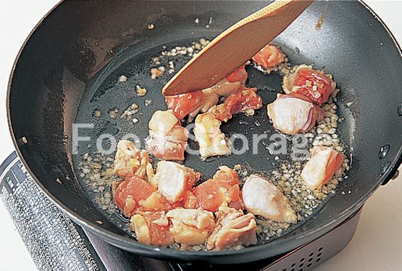 フライパンにサラダ油を熱して弱火にし、にんにく、しょうがを炒め、香りが立ったら中火にして鶏肉を入れ、色が変わるまで炒める。 |