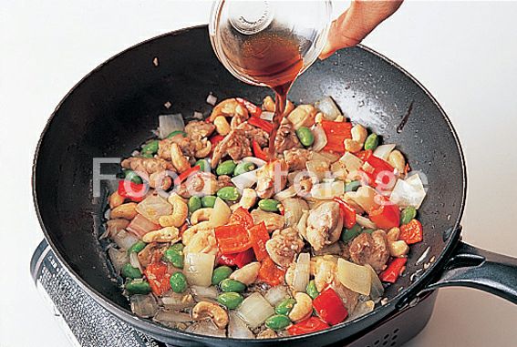 3にピーマン、玉ねぎを加えて炒め合わせ、玉ねぎがしんなりしたら長ねぎ、枝豆、カシューナッツを加えて炒める。油がなじんだらaを加え、汁けがなくなるまで炒め合わせる。 |