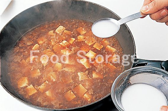 1の豆腐を静かに加えて3〜4分煮る。水溶き片栗粉を回し入れ、煮立ててとろみをつけ、花椒を加えてひと混ぜする。 |