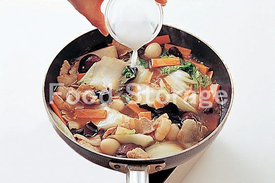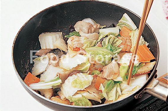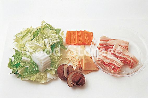 豚肉は5cm幅に切る。白菜は白い部分は薄いそぎ切り、葉はざく切りにする。にんじんは短冊切りにする。しいたけは軸を取って半分にそぎ切りにする。たけのこは薄切りにする。 |