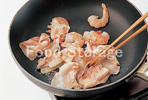 フライパンにサラダ油、しょうがを入れて弱火で炒め、香りが立ったら豚肉、えびを加えて色が変わるまで中火で炒める。 |