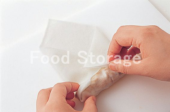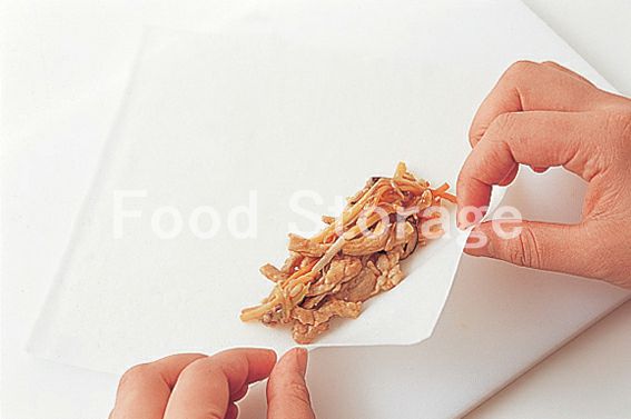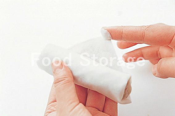 巻き終わりに、水溶き小麦粉少々を指でぬり、開かないようにとめる。 |