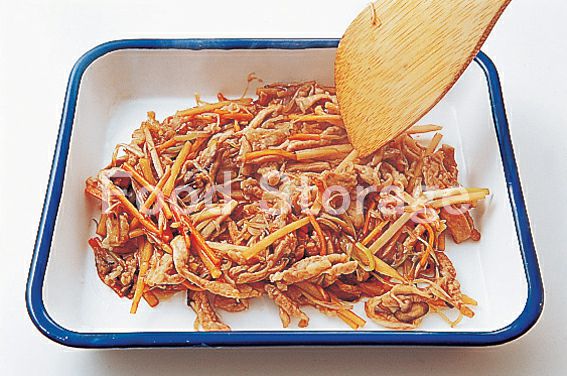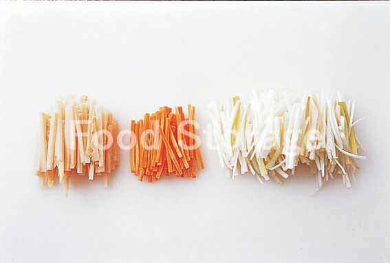 たけのこ、にんじん、長ねぎは細切りにする。 |