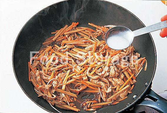 豚肉は細切りにし、塩、こしょうをまぶす。 |