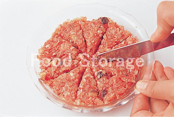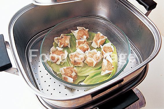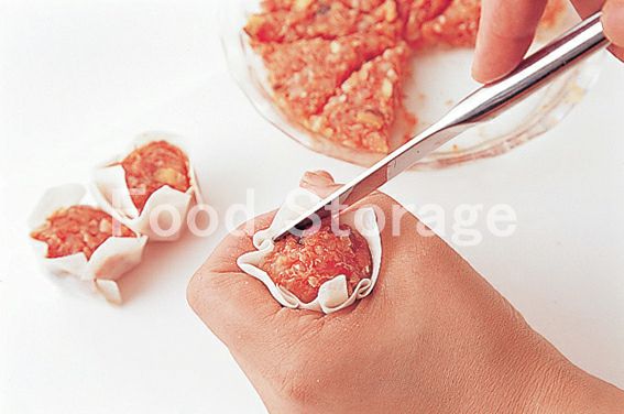 シュウマイの皮を左手にのせ、真ん中に7をのせる。左手で軽く握るようにして形を整え、バターナイフなどで表面を平らに整える。 |