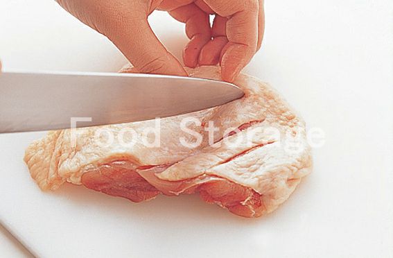 鶏もも肉は半分に切り、皮に切り込みを数か所入れる。 |