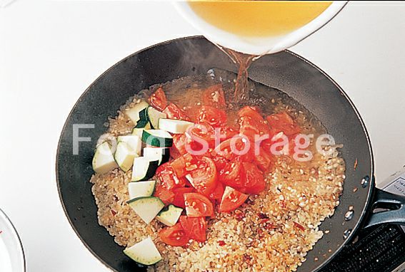 米を洗わずに加え、5のドライトマトも加えて炒め合わせる。 |