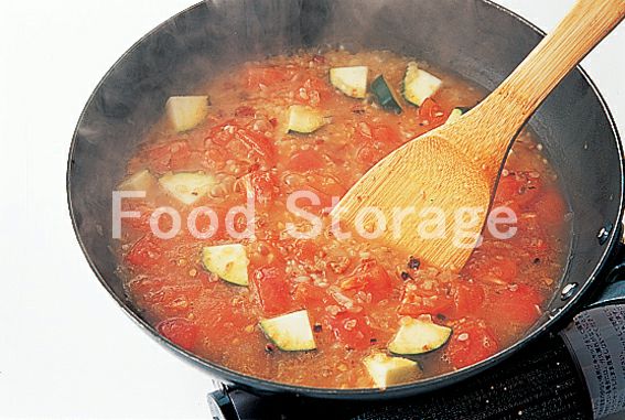 9に4のトマト 6を加えて炒め合わせ、7のスープの1/4量を加えて混ぜる。 |
