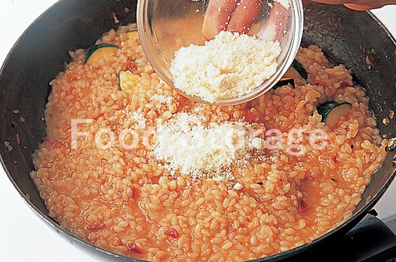 かき混ぜながら途中残りのスープを数回に分けて加え、中火で15分ほど加熱する。少し芯が残るくらいに炊き上げる。 |