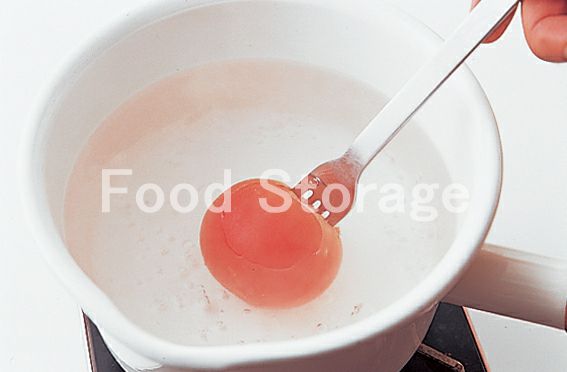 30秒ほどして皮が少しはじけてきたら、冷水にとって皮をむく。 |
