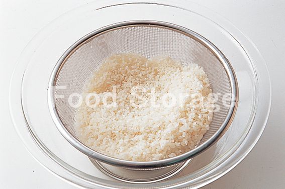 米は洗ってザルにあげ、しっかりと水けをきっておく。 |